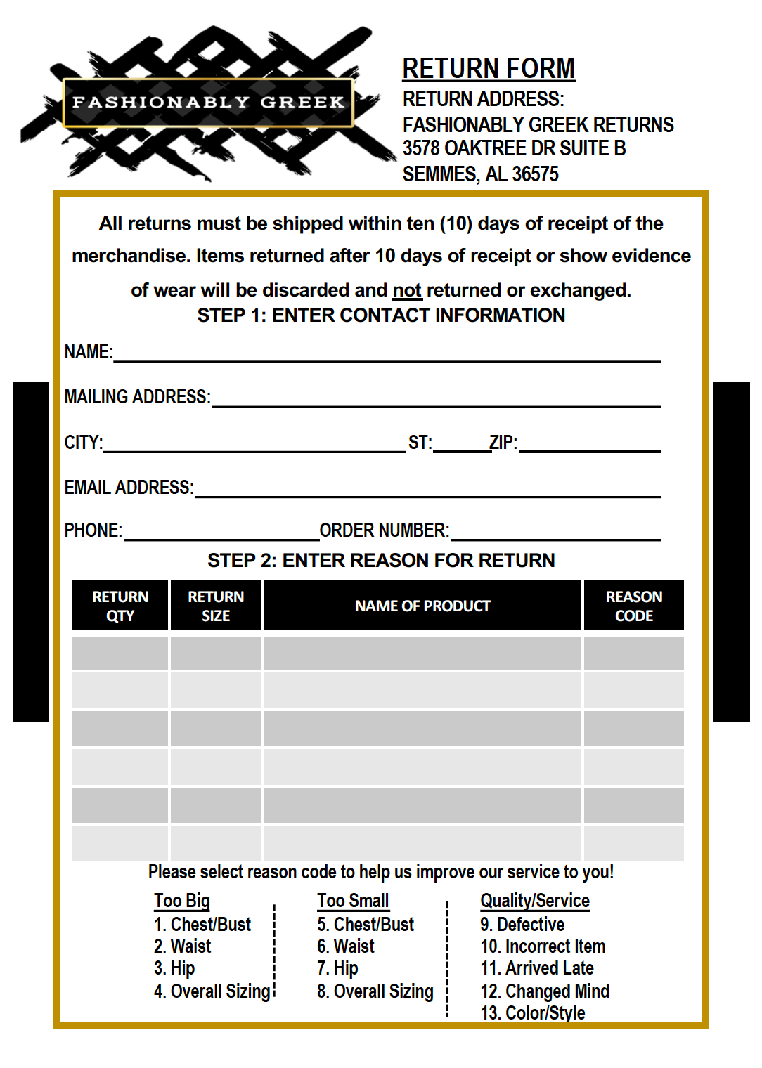 2. Mail the items you wish to return back to the address provided on the top of the return form within 10 days of receipt of the item(s). **Item(s) returned after 10 days of receipt or show evidence of wear will be destroyed and not returned or exchanged. ** You will be responsible for covering all shipping costs to return your item(s). This includes the shipping cost to return the item(s) to the return address, as well as the shipping costs for shipment of the new item(s).